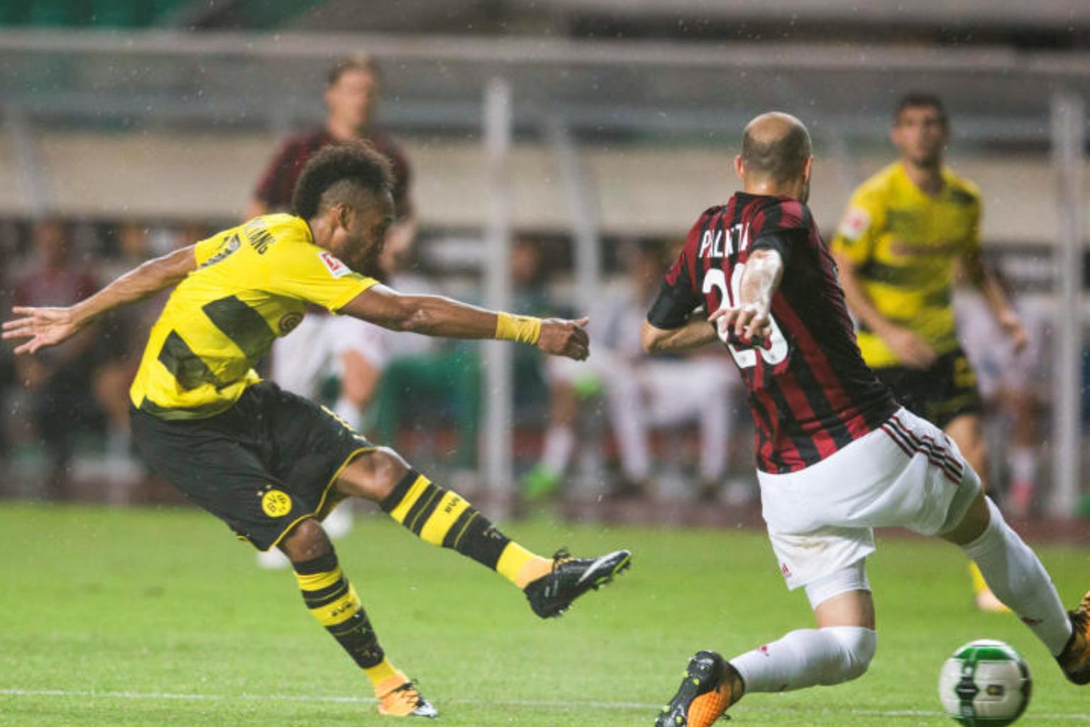 Borussia Dortmund's Pierre-Emerick Aubameyang attempts a shot past AC Milan's Gabriel Paletta on July 18, 2017.