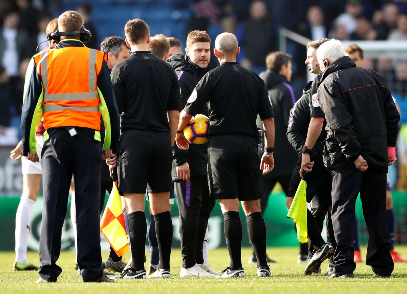 Tottenham manager Mauricio Pochettino remonstrates with referee Mike Dean.