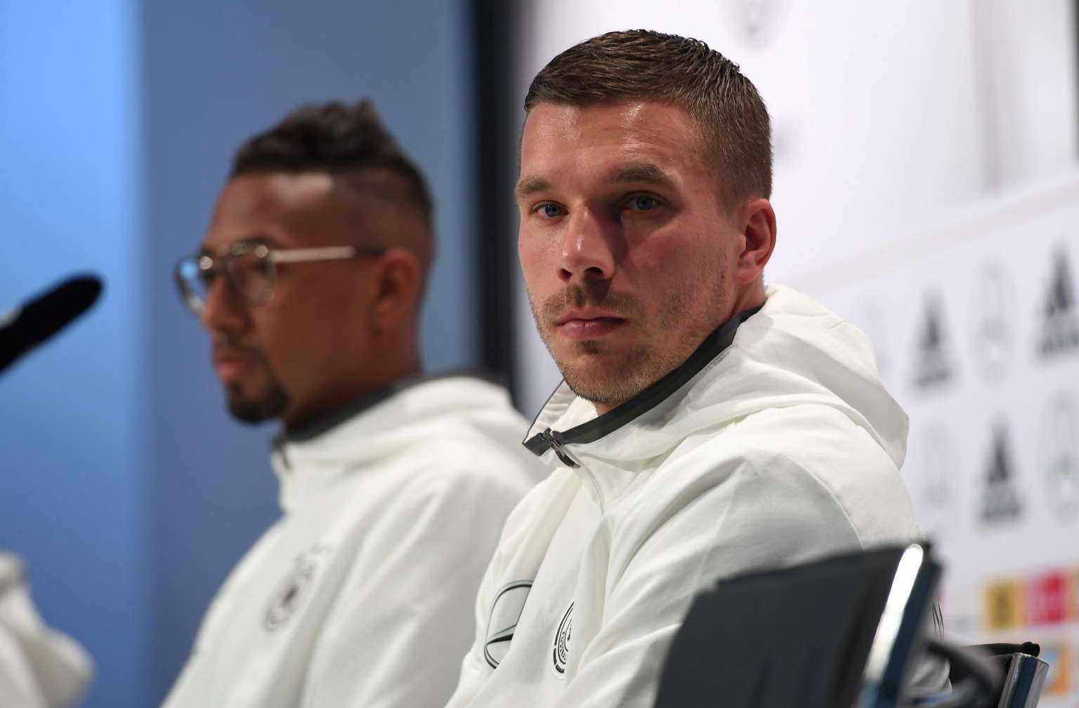 Germany's midfielder Lukas Podolski (right) at a press conference in Evian on June 14, 2016, during the Euro 2016 football tournament.