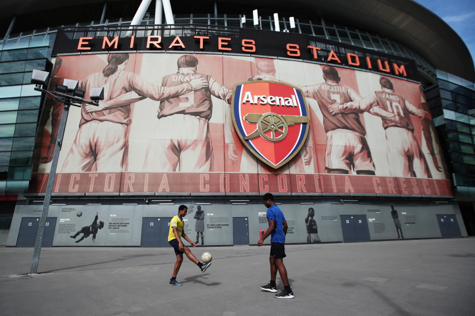 People play football outside the Emirates Stadium in London, Britain, on May 17, 2020.
