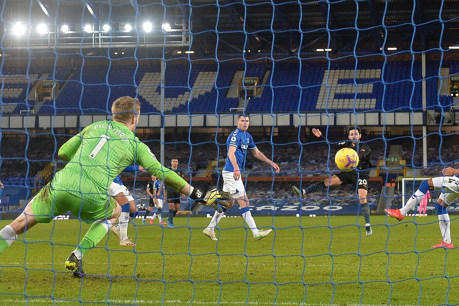 Bernardo Silva scores during an English Premier League soccer match in Liverpool, on Feb 17, 2021.