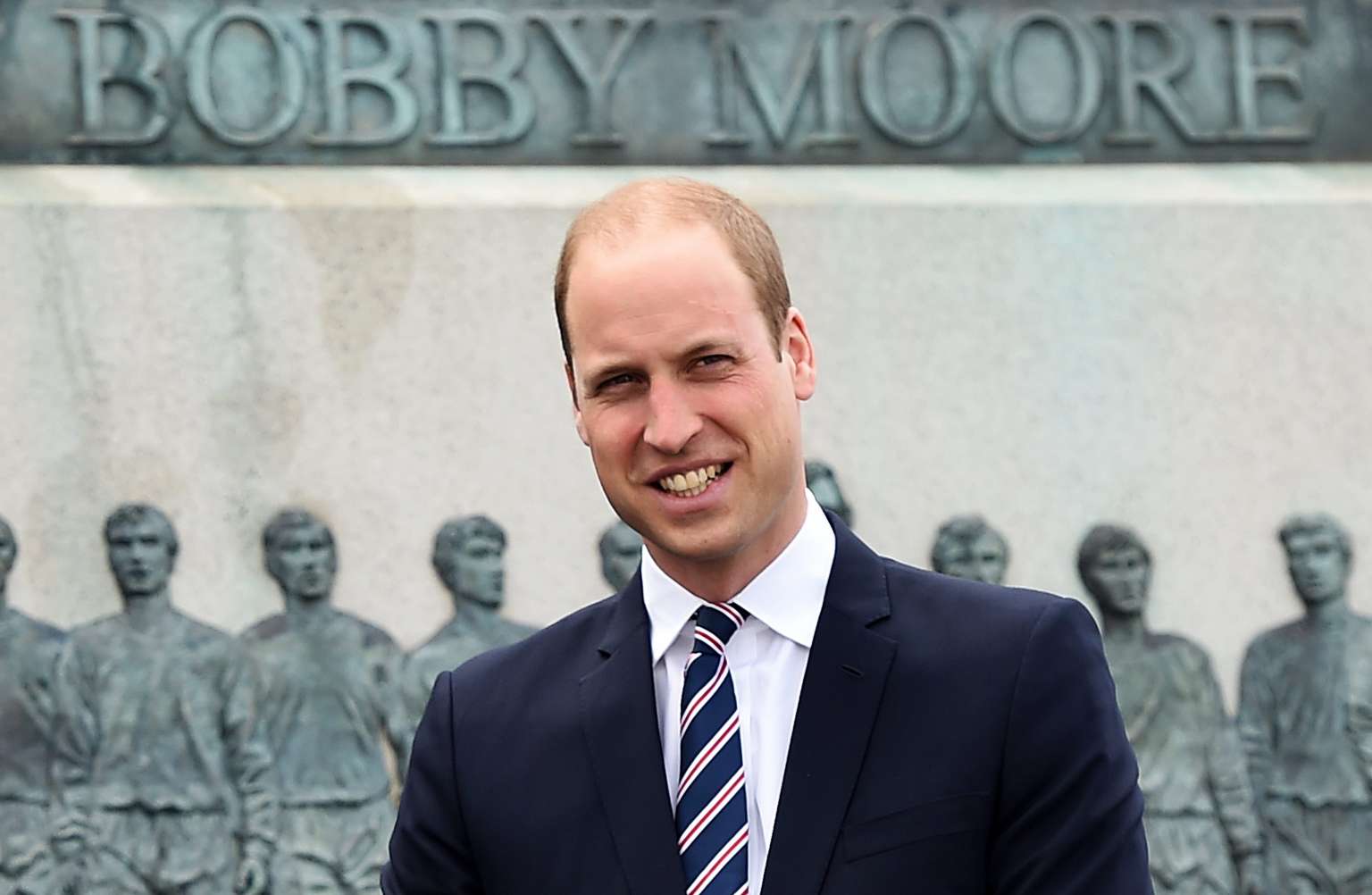 Prince William stands in front of the Bobby Moore statue as he visits Wembley Stadium in London, April 6, 2016.