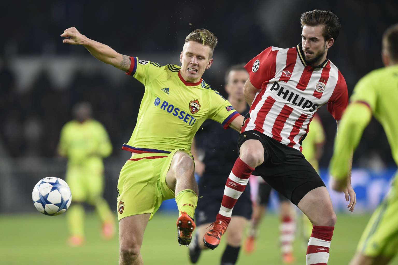 CSKA Moscow's Pontus Wernbloom (left) vies with PSV Eindhoven's Davy Propper.