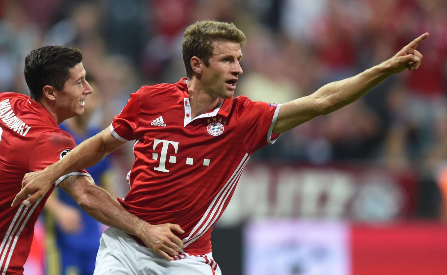 Bayern Munich striker Thomas Mueller (right) celebrates scoring the 2-0 goal with teammate Robert Lewandowski.