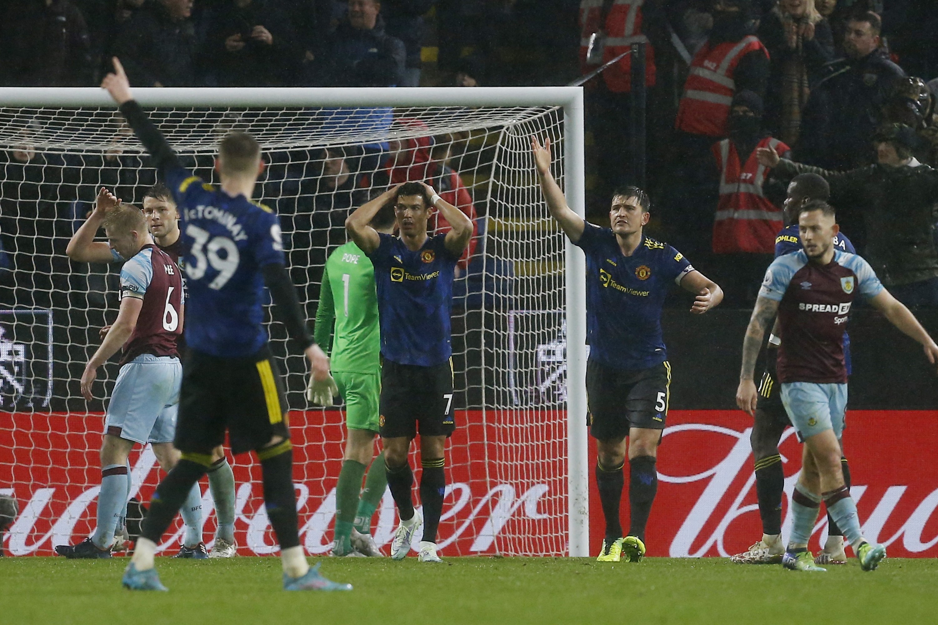 Manchester United's Cristiano Ronaldo reacts after missing a chance to score against Burnley on Feb 8, 2022.