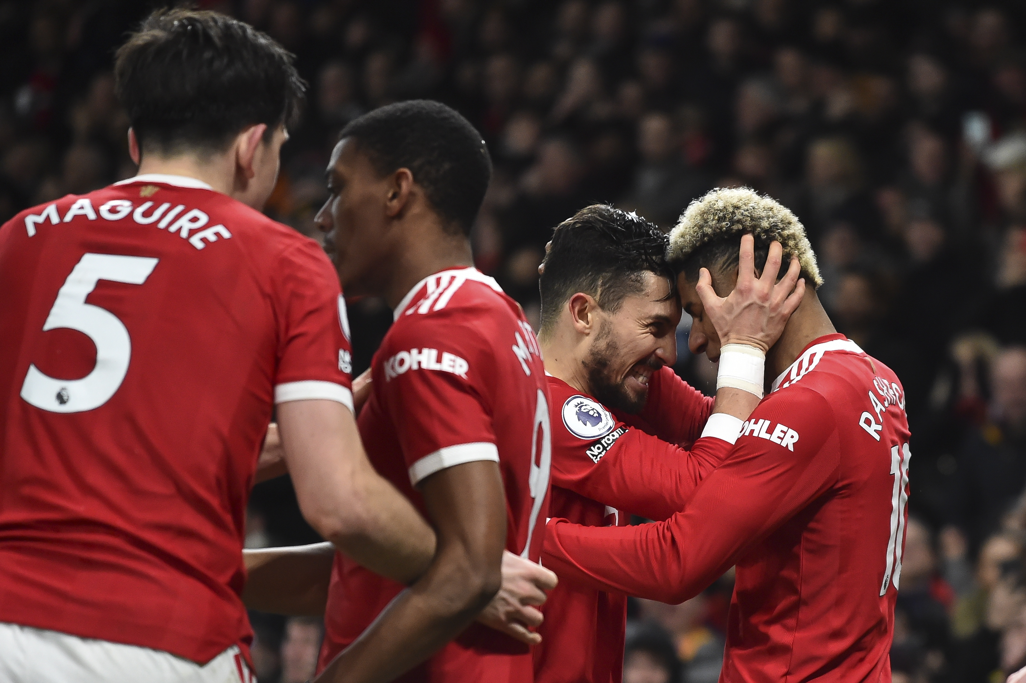 Marcus Rashford (right) celebrates with teammates after scoring for United.