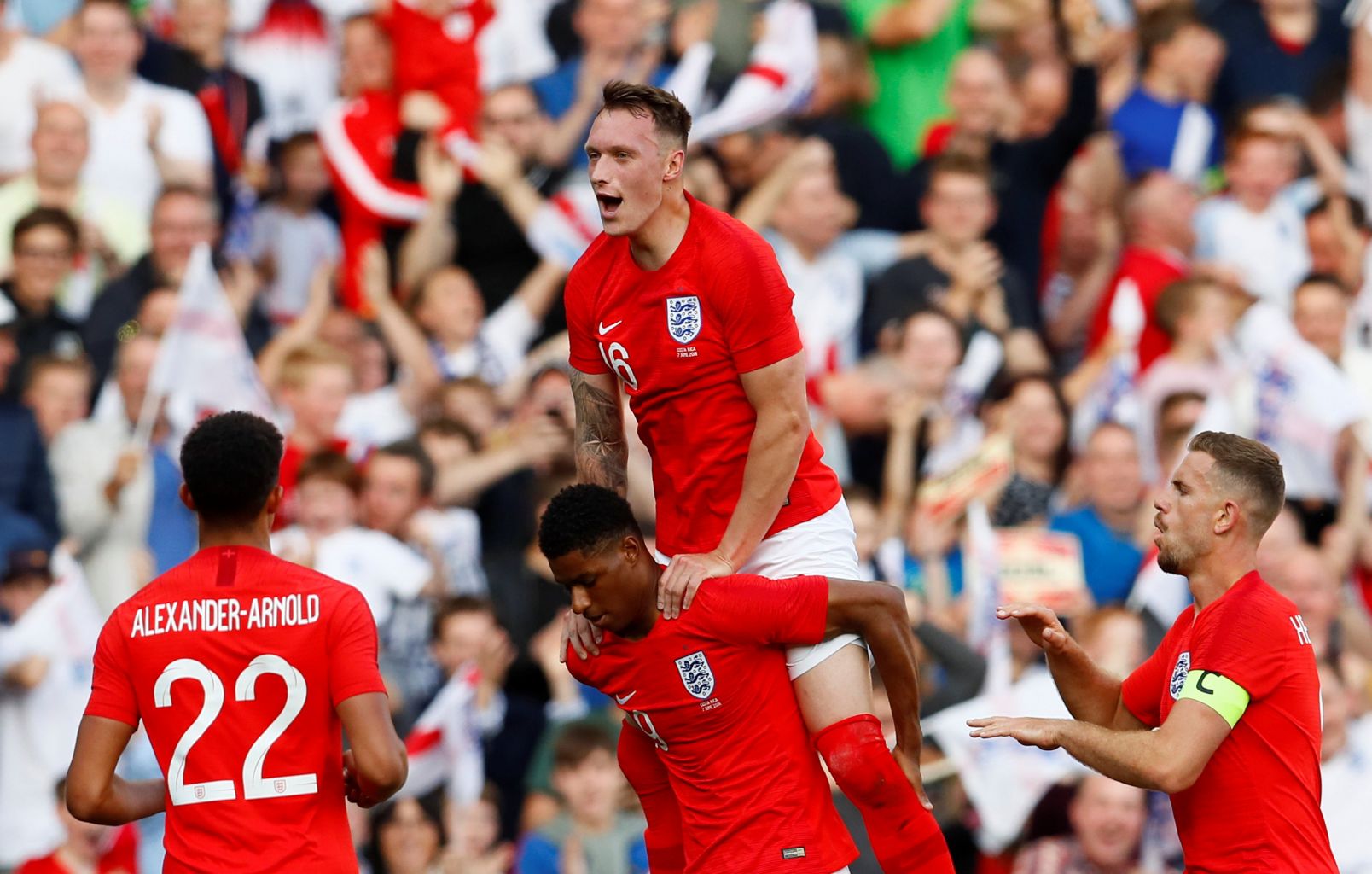 England's Marcus Rashford celebrates scoring their first goal with Phil Jones and team mates.
