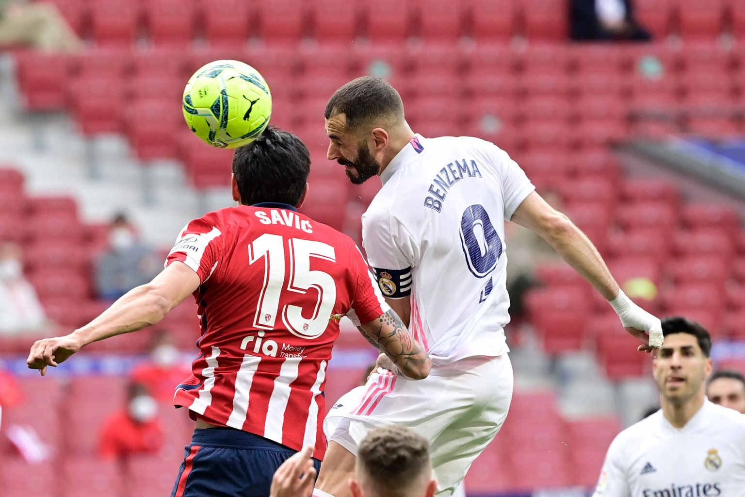 Atletico Madrid's Stefan Savic (left) and Real Madrid's Karim Benzema jump for the ball on March 7, 2021.