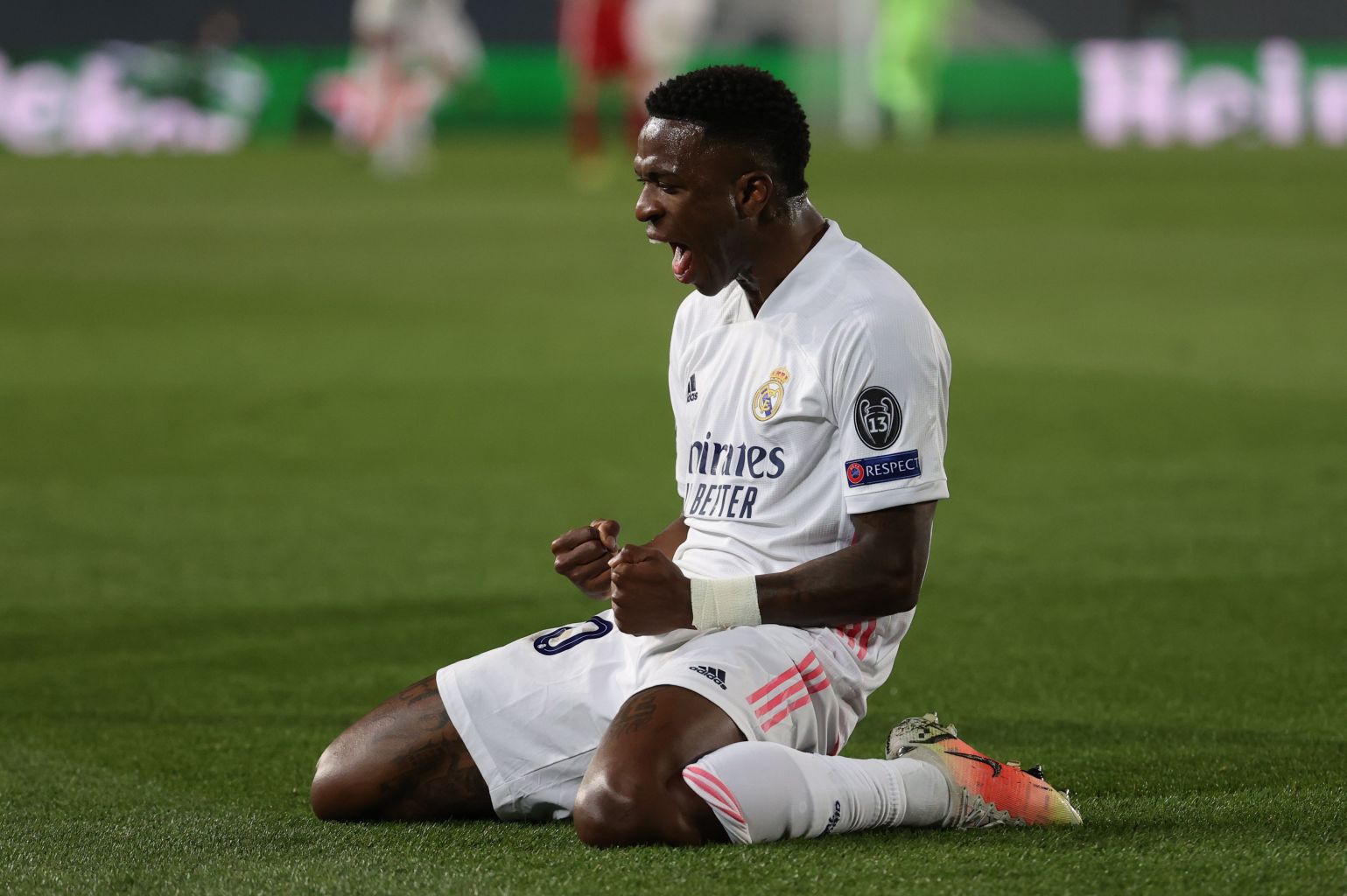 Real Madrid striker Vinicius Jr celebrates after scoring the 1-0 lead against Liverpool.