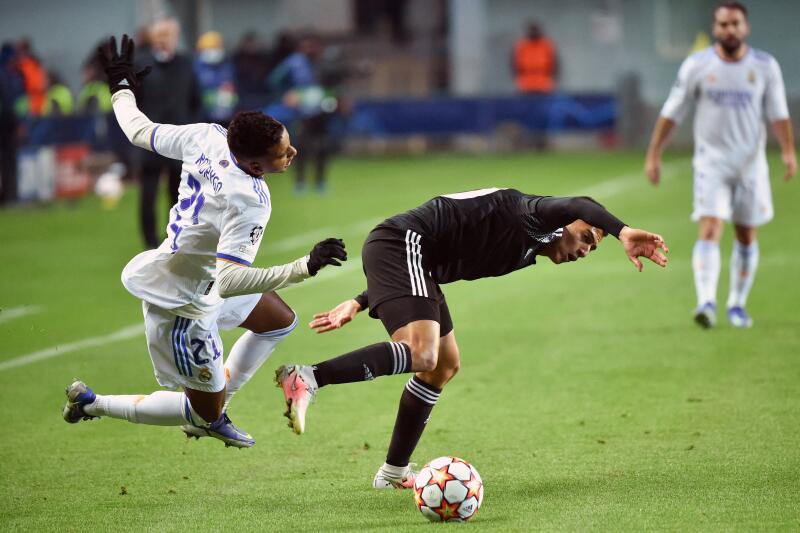 Real Madrid's Brazilian forward Rodrygo and Sheriff's Colombian forward Frank Castaneda vie for the ball on Nov 24, 2021.