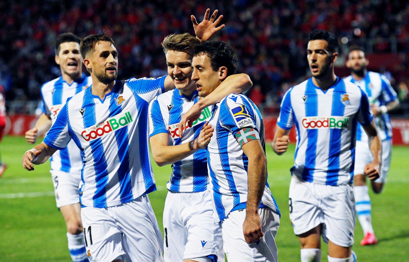Real Sociedad's Mikel Oyarzabal (centre, right) celebrates with team mates after scoring the 1-0 lead.