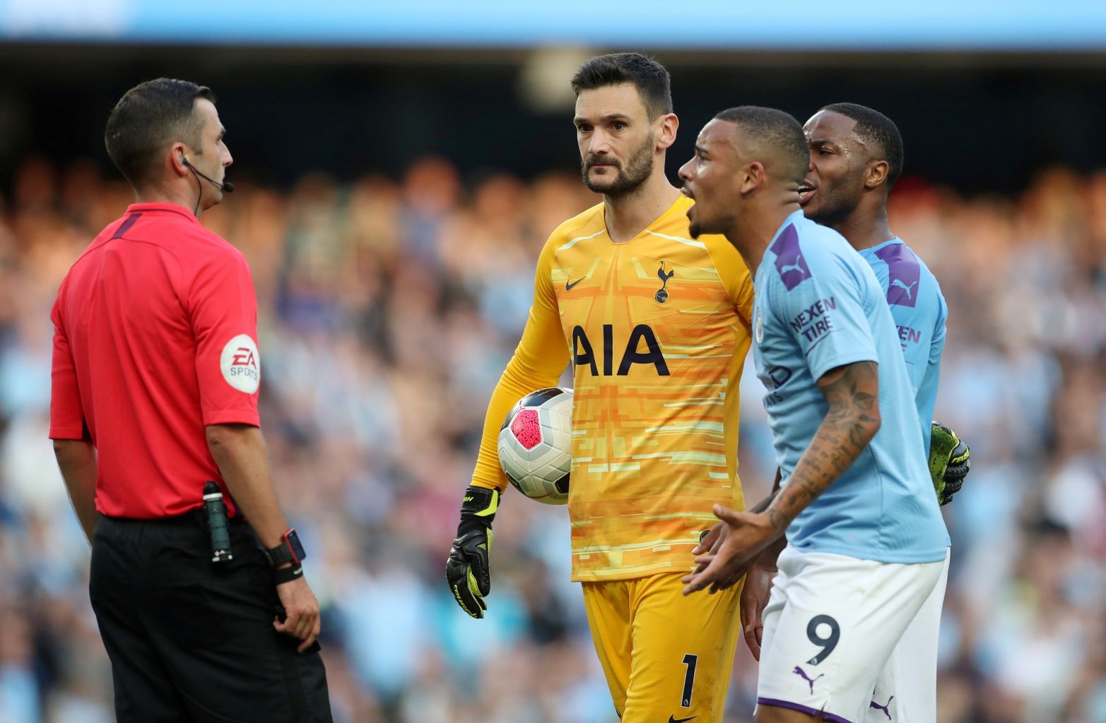 Manchester City's Gabriel Jesus remonstrates with referee Michael Oliver after his goal is disallowed following a VAR review.