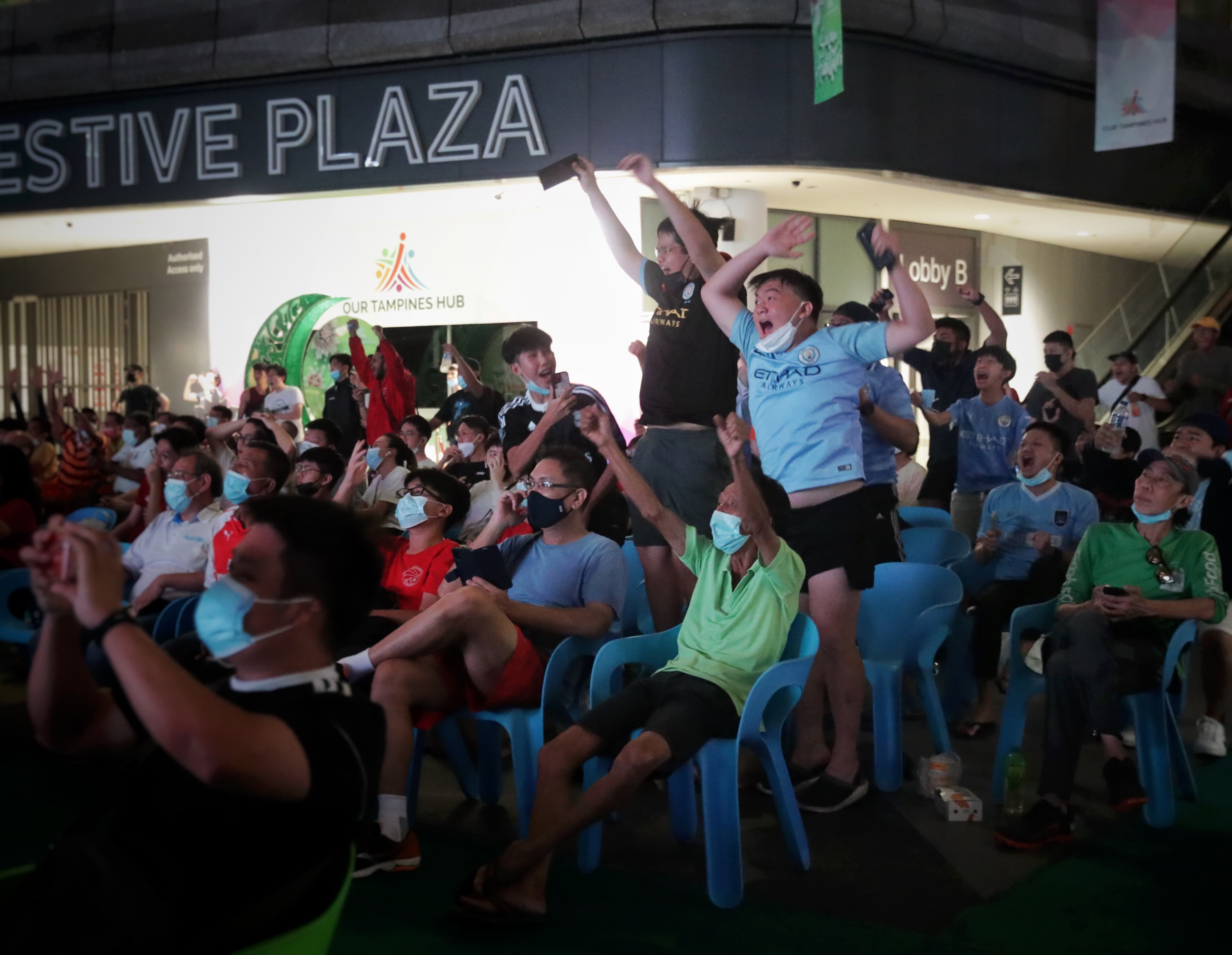 Manchester City fans cheering during a live screening of the game against Aston Villa, at Our Tampines Hub, on May 22, 2022.