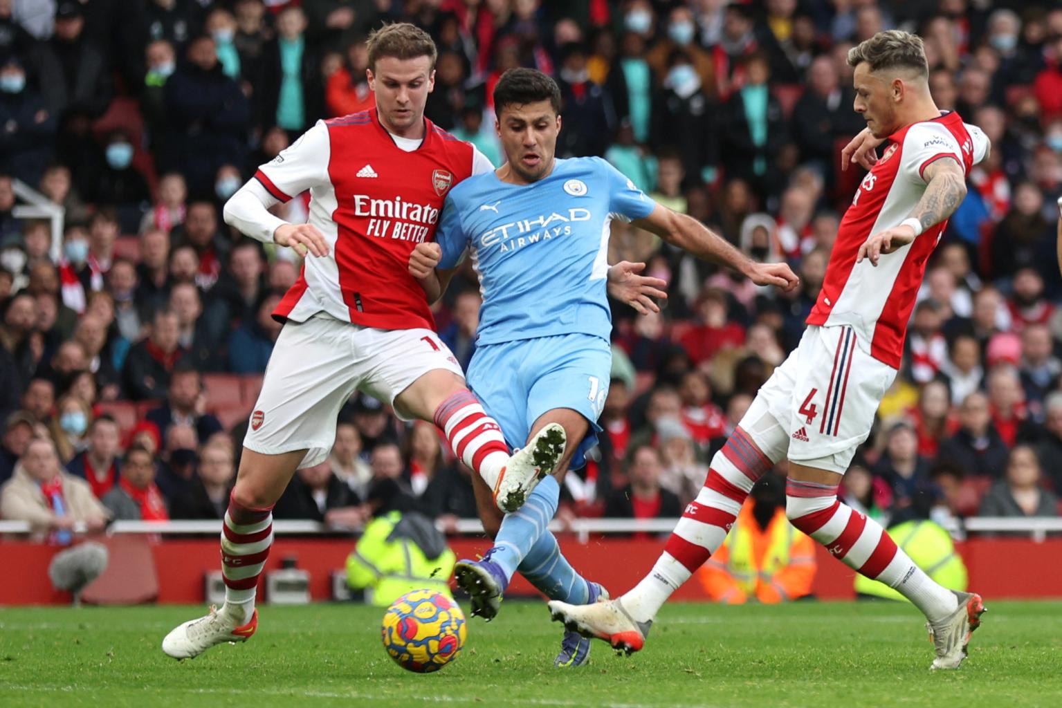Rodri (centre) during the English Premier League football match between Arsenal and Manchester City in London on Jan 1, 2022.