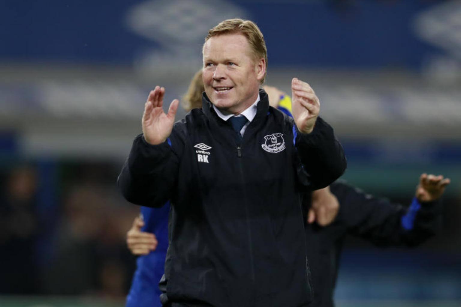 Everton manager Ronald Koeman applauds fans after the match.