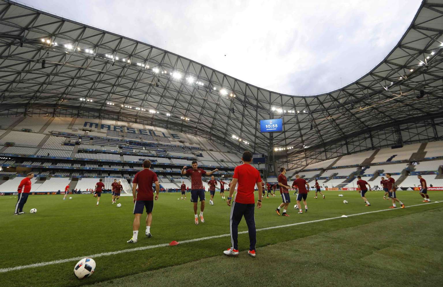 Russia's players attend a training session, on June 10, 2016, at the Stade Velodrome in Marseille, France.