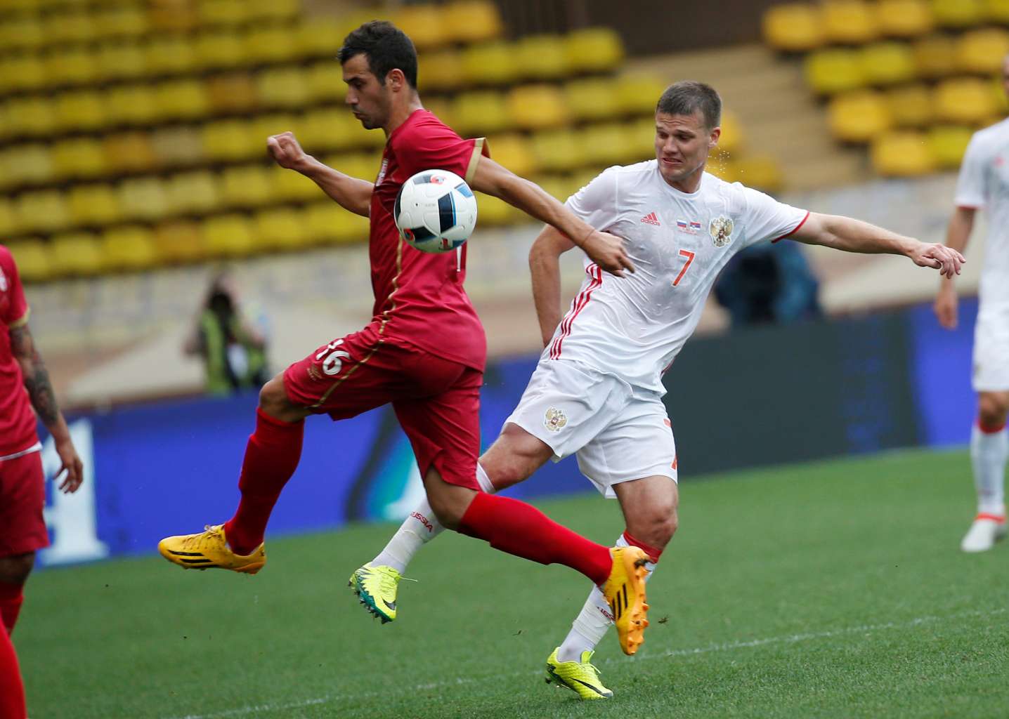 Russia's Igor Denisov (right) in action at the international friendly football match between Russia and Serbia on June 5, 2016.