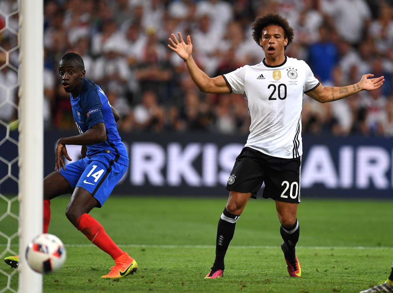 Leroy Sane (right) eyes the ball during the Euro 2016 semi-final football match between Germany and France in Marseille, on July 7, 2016.