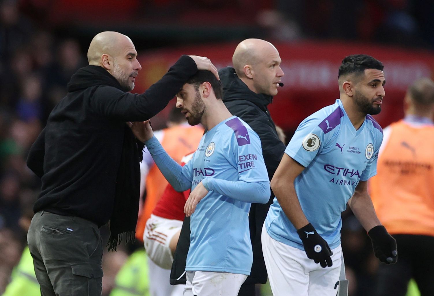 Manchester City's Bernardo Silva with manager Pep Guardiola as he is substituted for Riyad Mahrez.