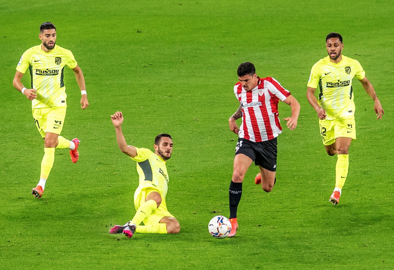 Athletic's defender Ander Capa vies for the ball against Atletico's midfielder Koke Resurreccion during the Spanish LaLiga soccer match on April 25, 2021.