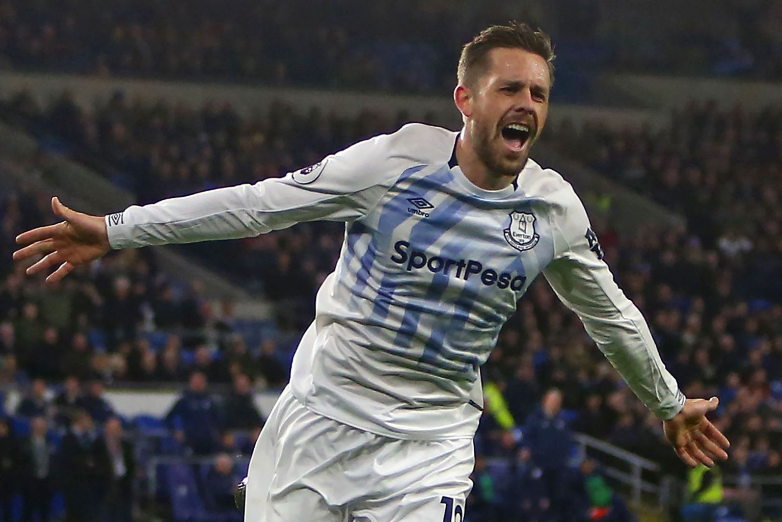 Everton's Icelandic midfielder Gylfi Sigurdsson celebrates after scoring their second goal.