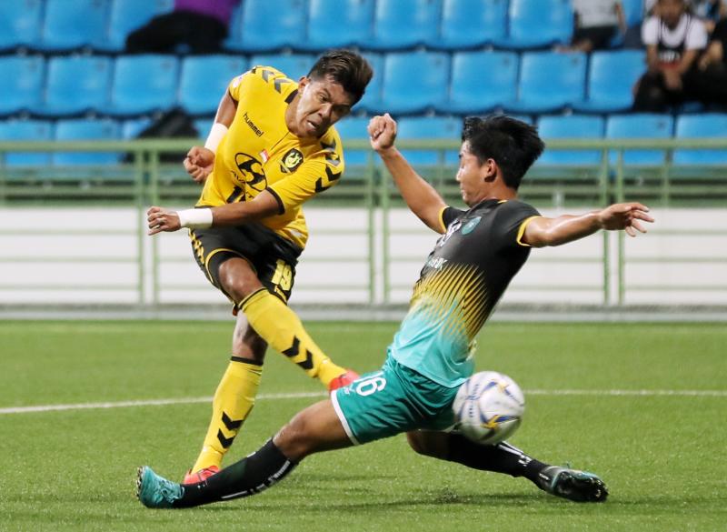 Khairul Amri (left) attempts to kick the ball past Yangon United‘s Thu Rein Soe during the AFC Cup match at Jalan Besar Stadium on May 1, 2019.