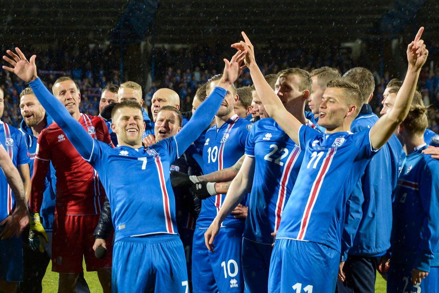 Iceland's players celebrate after the FIFA World Cup 2018 qualification football match between Iceland and Kosovo in Reykjavik, Iceland on Oct 9, 2017.