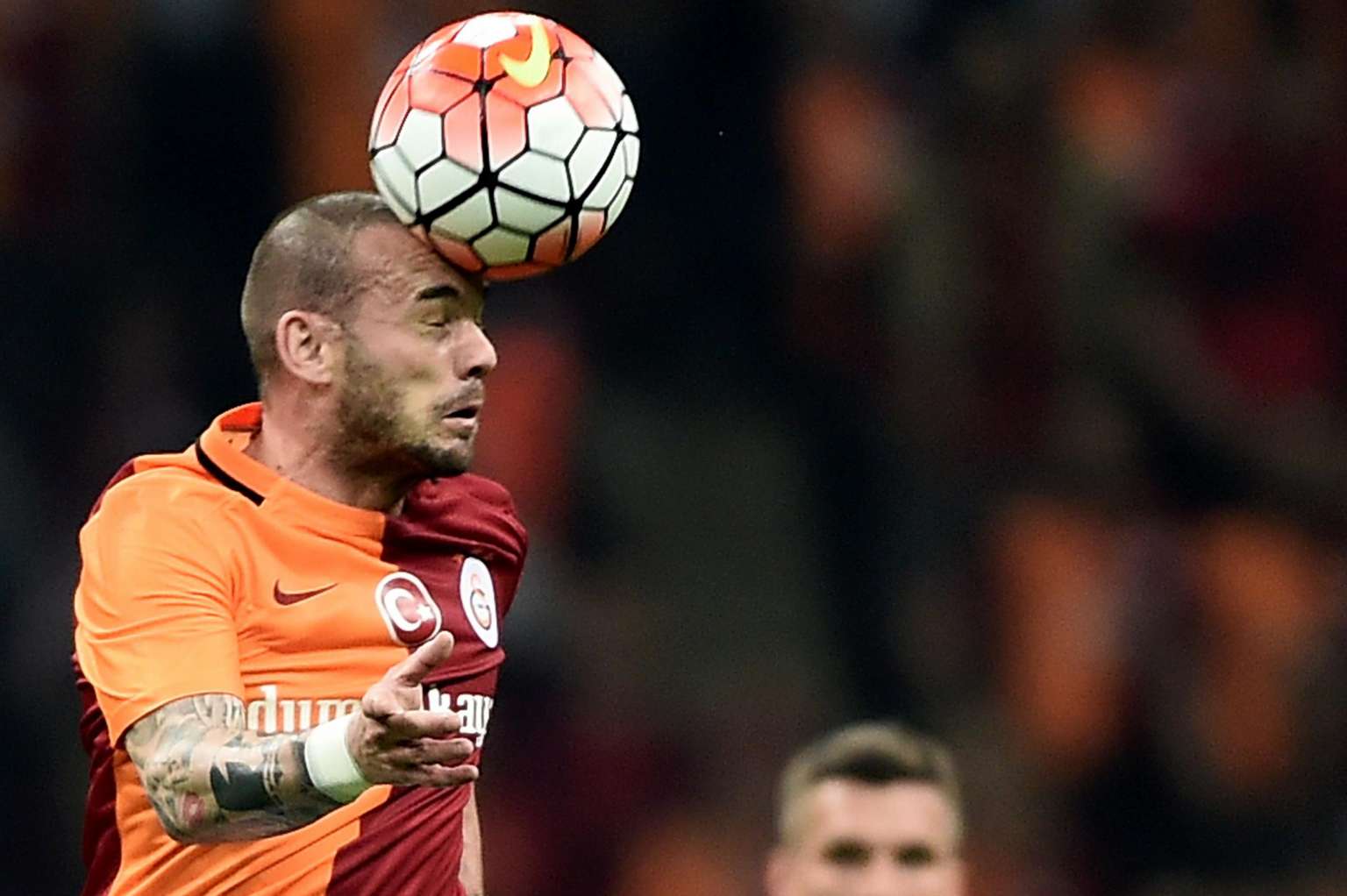 Galatasaray`s Wesley Sneijder heads the ball during the Turkish Spor Toto Super League football match against Fenerbahce on April 13, 2016, in Istanbul.