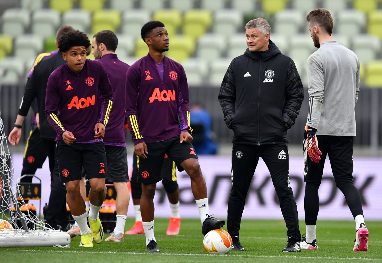 United manager Ole Gunnar Solskjaer (second right) during the club's taining session in Gdansk, Poland..