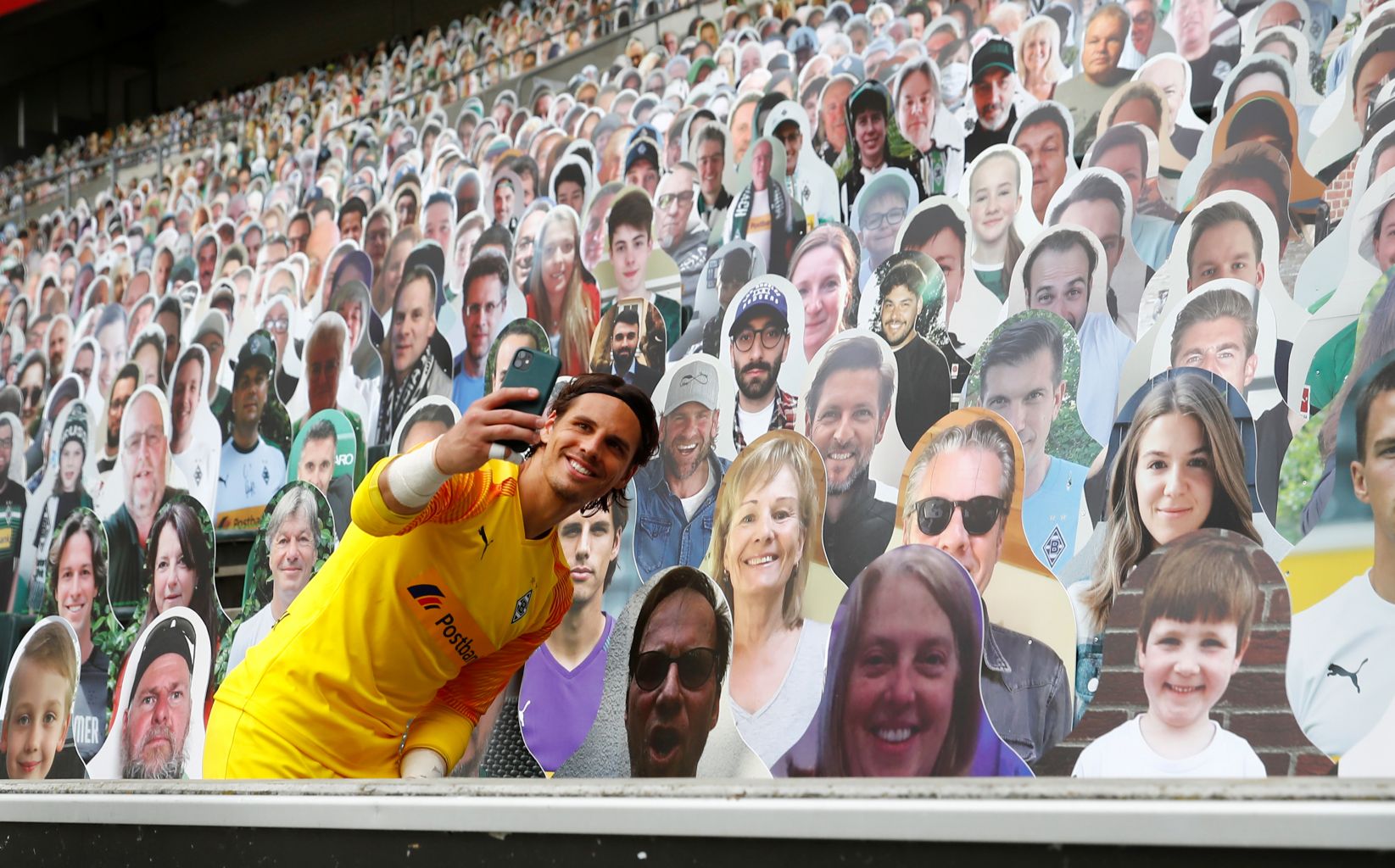 Borussia Moenchengladbach's Yann Sommer takes a selfie with cardboard fans in June 2020.