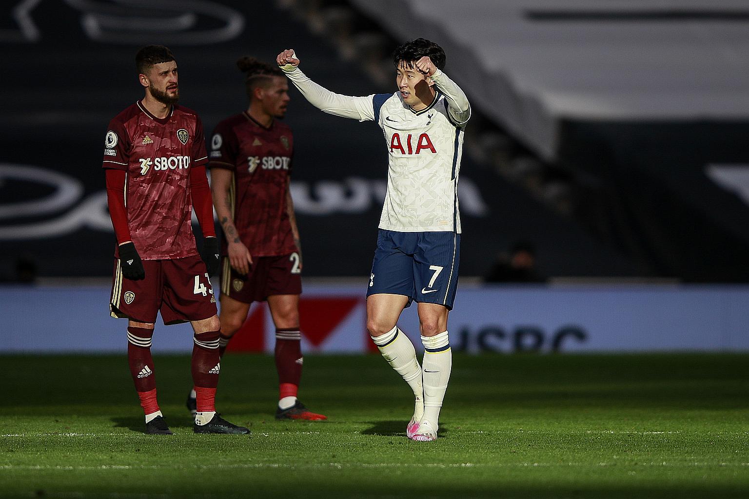 Son Heung-min celebrates after scoring in the 3-0 defeat of Leeds United.