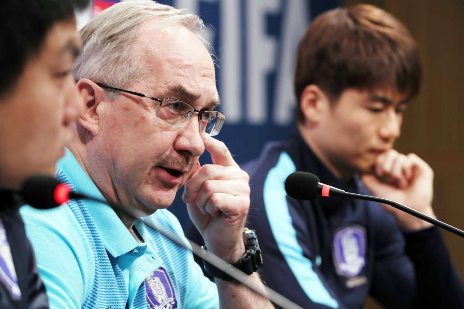 South Korea's national football team head coach Uli Stielike (centre) speaks during a press conference at the National Football Center in Paju, South Korea, on March 27, 2017.