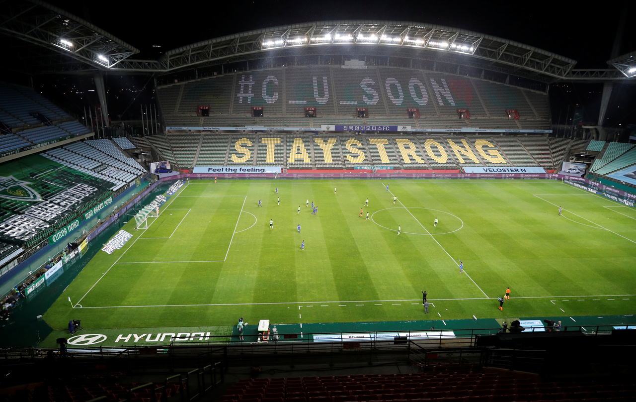 The Jeonju World Cup Stadium, home turf of Jeonbuk, was not filled with fans but giant yellow and white cards saying "#CU SOON STAY STRONG" were placed on empty seats, while coaches and substitutes wore face masks.