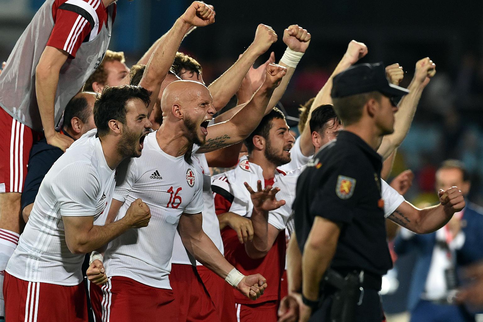 Georgia's players celebrating their 1-0 victory over Spain.