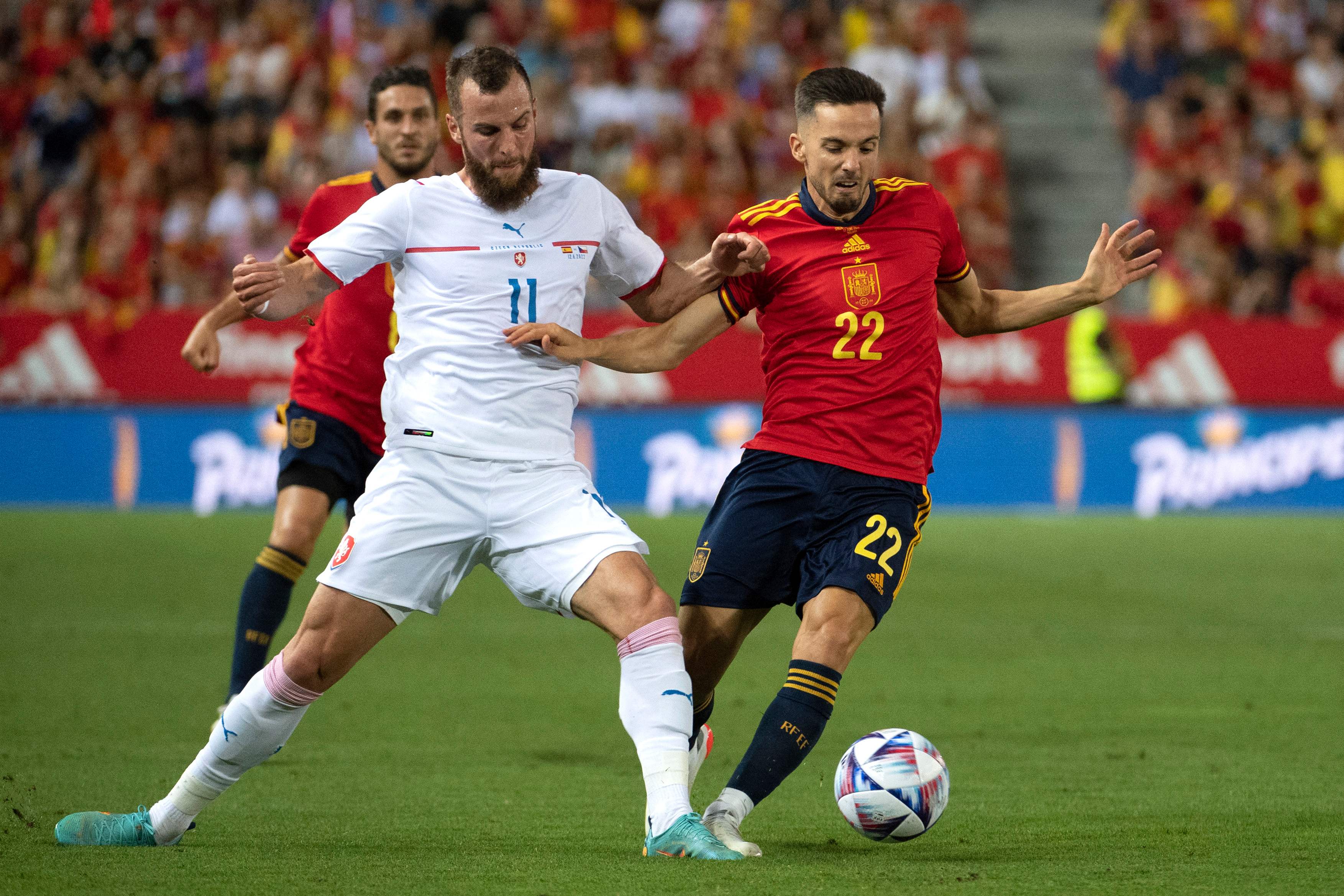 Czech Republic's Vaclav Jurecka (left) challenges Spain's Pablo Sarabia during their Nations League match in Malaga on June 12, 2022.