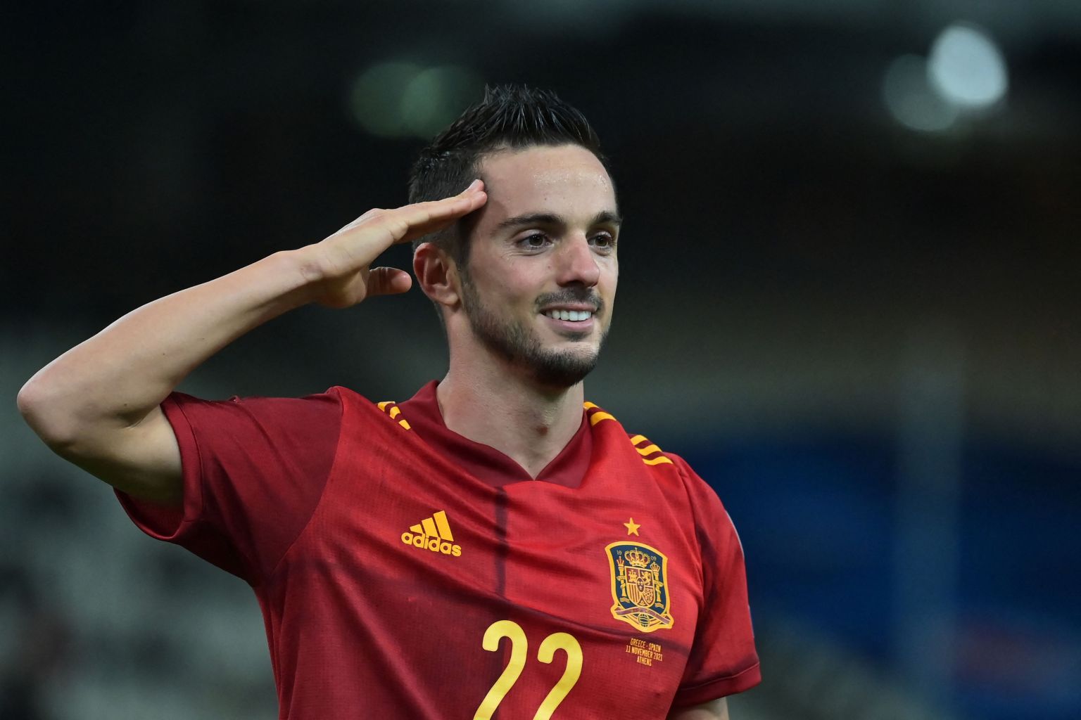 Spain's Pablo Sarabia celebrates after scoring a penalty during the match against Greece.