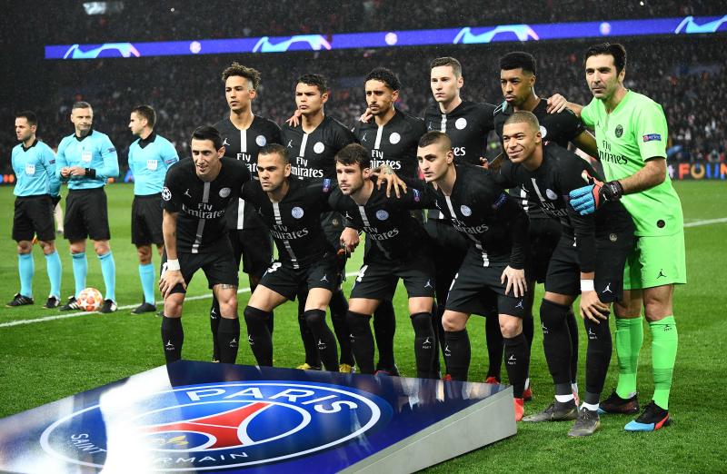 Paris Saint-Germain's players pose for a team picture prior to the UEFA Champions League round of 16 second-leg football match between Paris Saint-Germain and Manchester United at the Parc des Princes stadium in Paris, France on March 6, 2019.