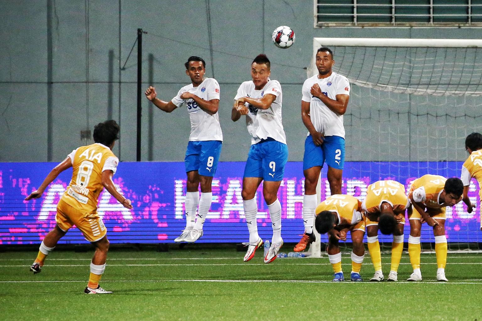 Albirex Niigata's Masaya Idetsu (left) taking a free kick during the SPL match against Lion City Sailors last month.