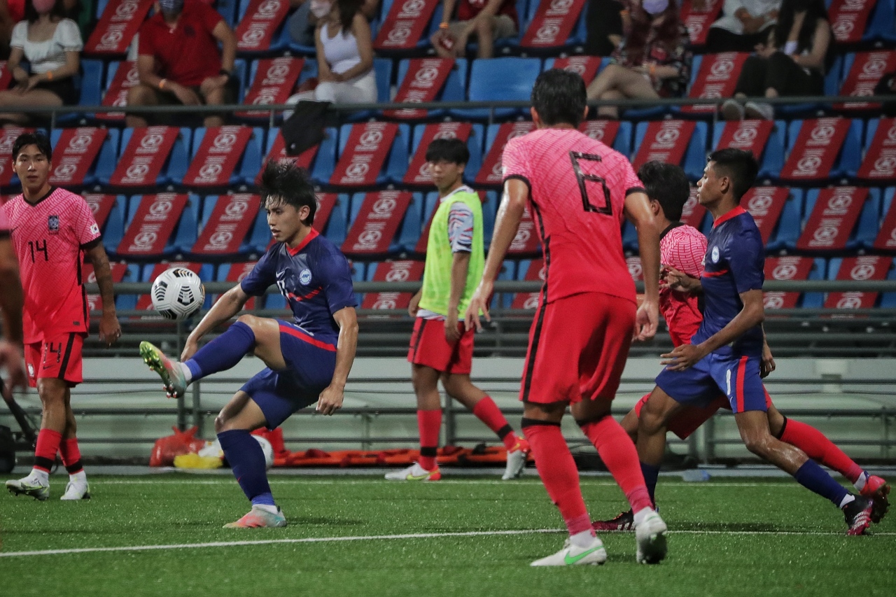 Singapore’s Glenn Kweh (second from left) during the U-23 Asian Cup qualifier against South Korea at Jalan Besar Stadium on Oct 31, 2021.