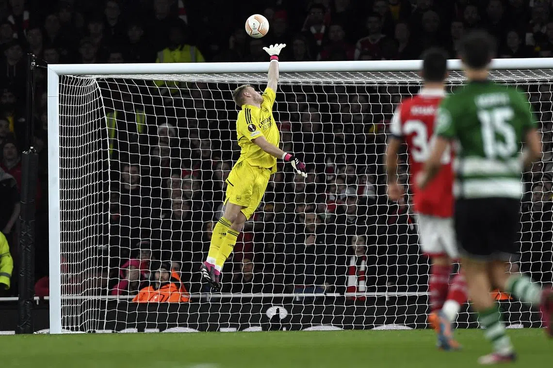 Arsenal goalkeeper Aaron Ramsdale is unable to stop Pedro Goncalves' stunning long-range strike which allowed Sporting to equalise their Europa League last-16 second-leg tie at 1-1.
