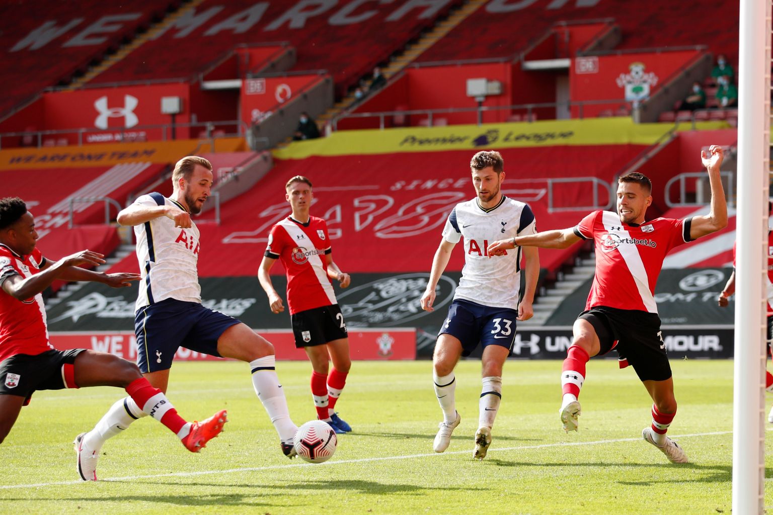 Harry Kane shooting to score and wrap up Tottenham Hotspur's 5-2 English Premier League win over Southampton at St Mary's Stadium on Sept 20, 2020.