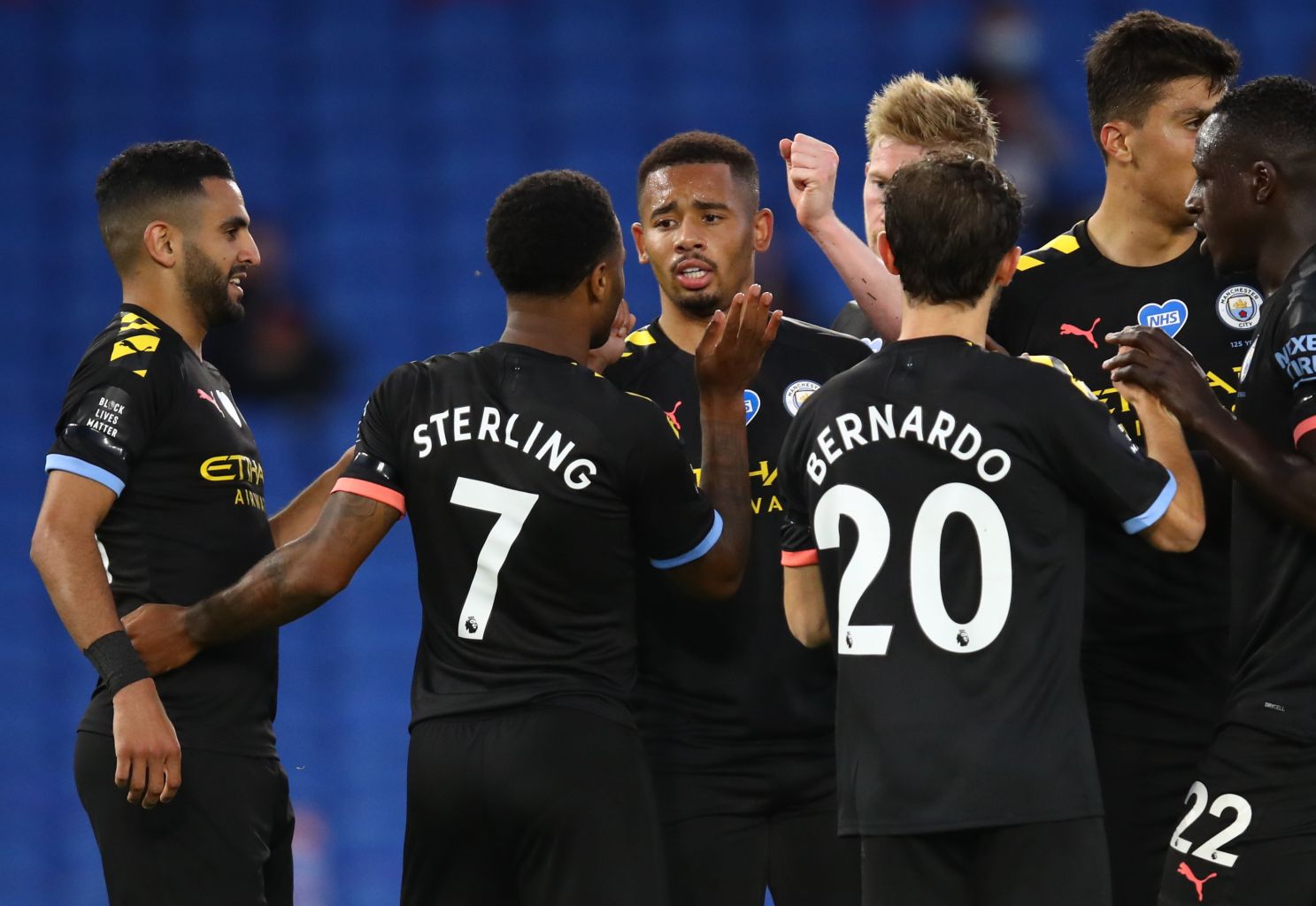 City's Raheem Sterling celebrates scoring their third goal with teammates.