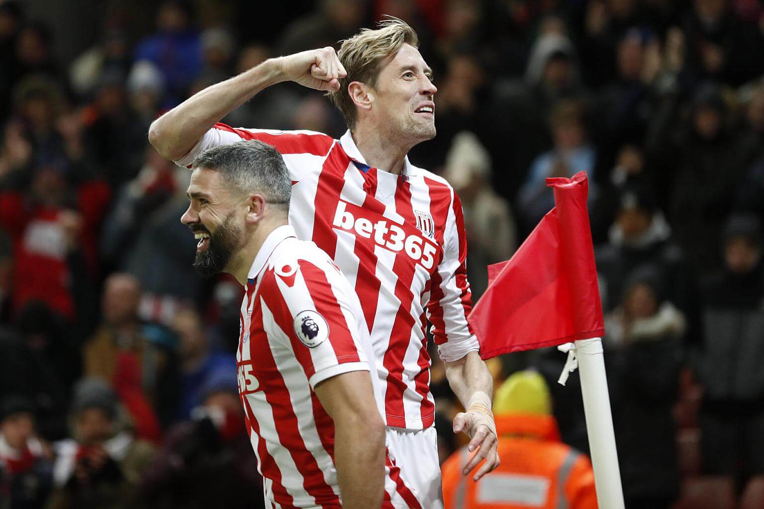 Stoke City's Peter Crouch celebrates scoring their second goal with Jonathan Walters.