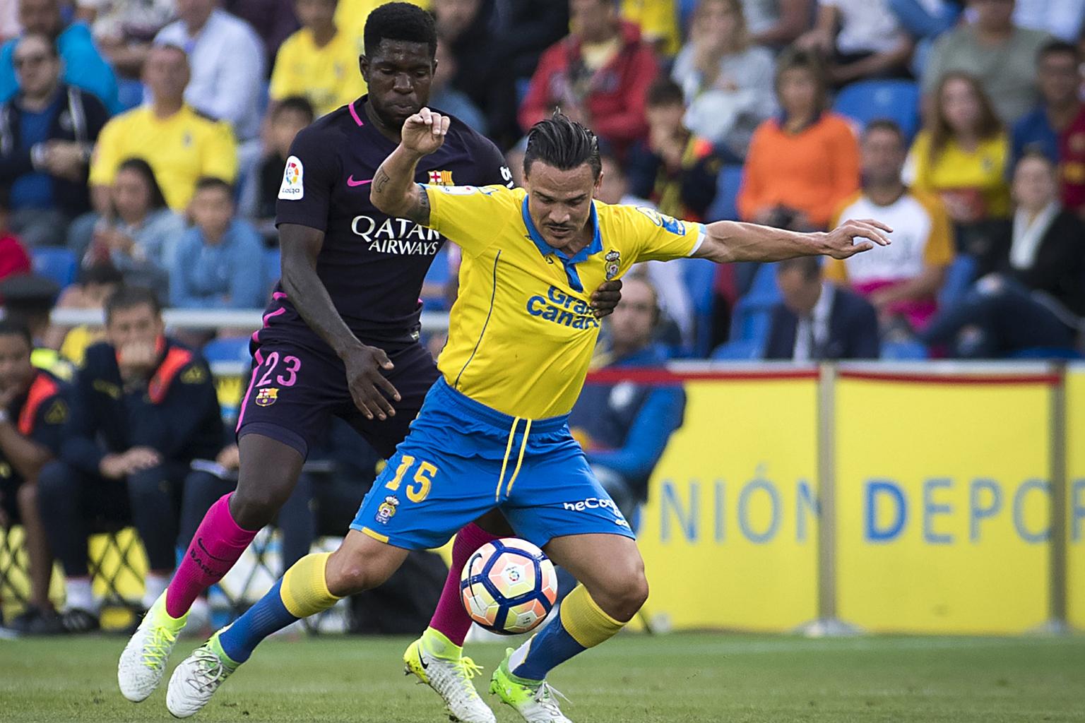 Las Palmas' midfielder Roque Mesa Quevedo (right) vies with Barcelona's French defender Samuel Umtiti during the Spanish league football match at the Gran Canaria stadium in Las Palmas de Gran Canaria on May 14, 2017.