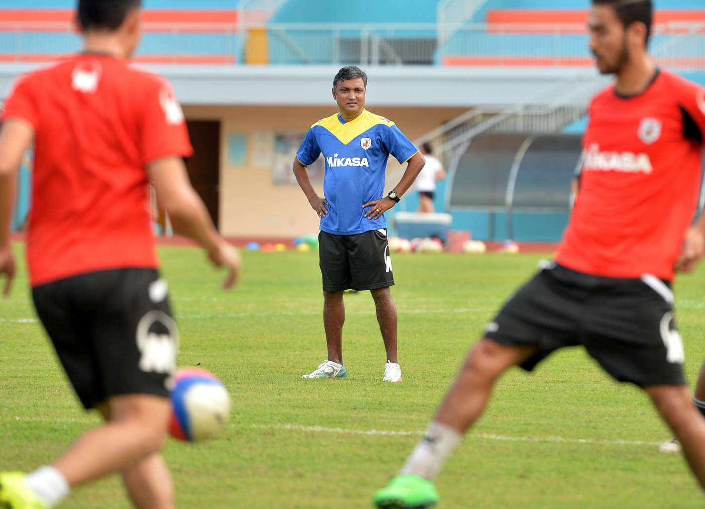 Coach V. Sundramoorthy (centre) overseeing a Tampines Rovers training session, on July 30, 2015.