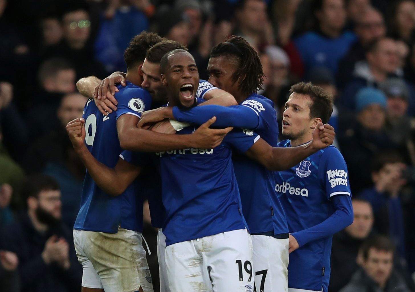 Everton's Djibril Sidibe and team mates celebrate after the match.