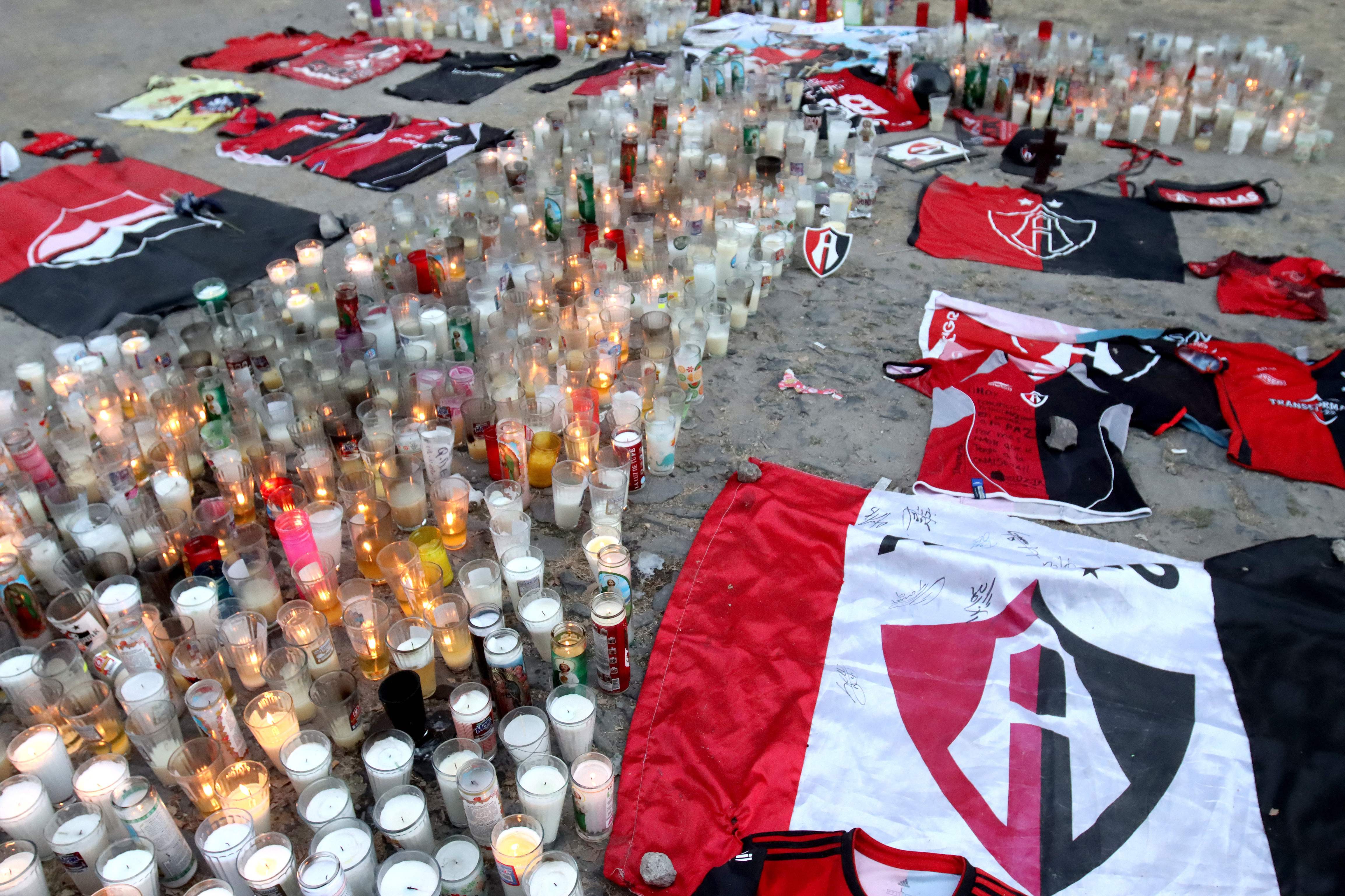 Memorabilia of Mexican football team Atlas and candles are seen during a mass held outside Jalisco Stadium in Guadalajara, Jalisco State, Mexico, on March 7, 2022, for the people injured in fights that broke out during the March 5 Mexican League match between Queretaro and Atlas.