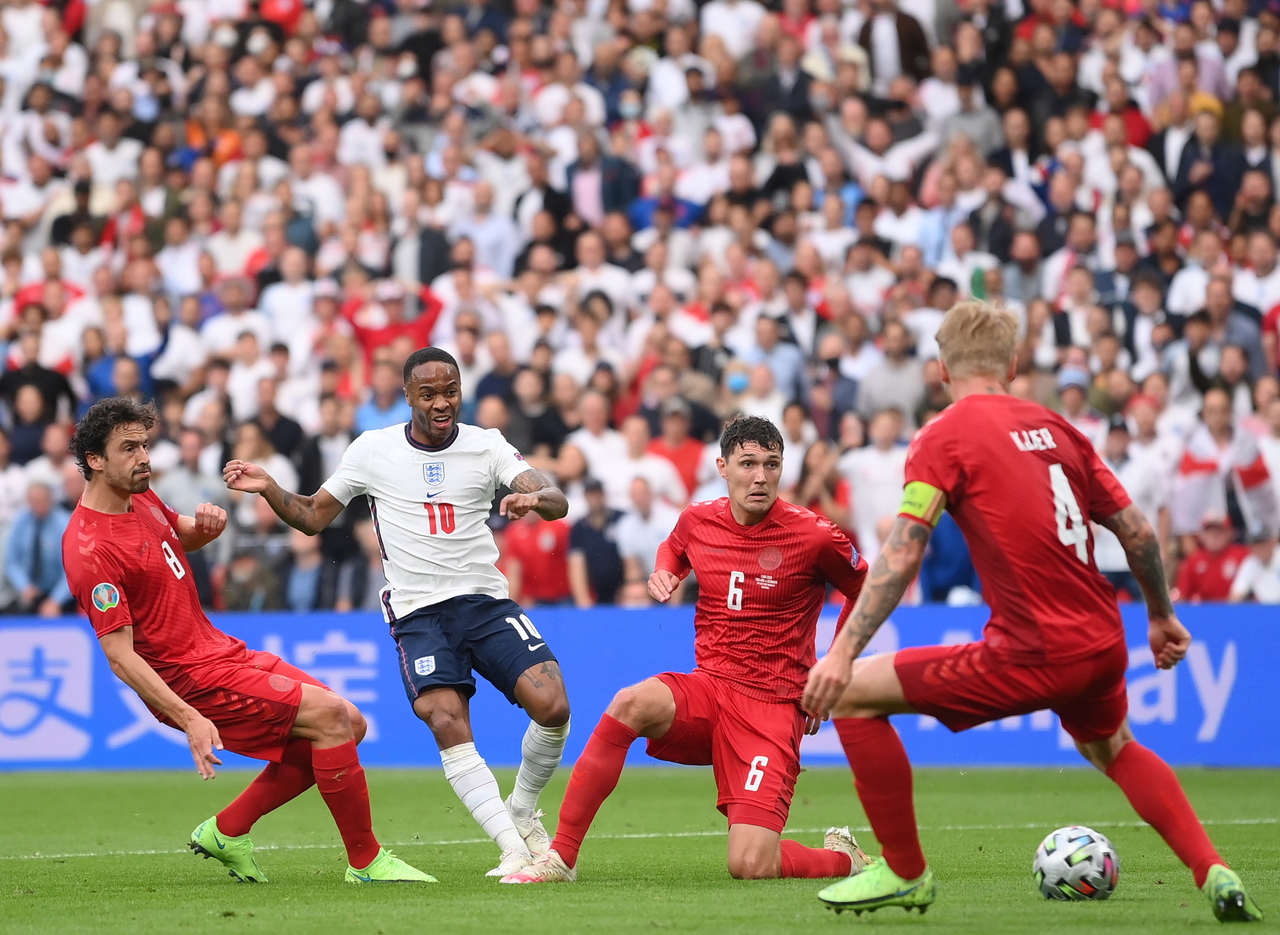Raheem Sterling (second from right) takes a shot on goal against Denmark during the Euro 2020 semi-final in London on July 7, 2021.