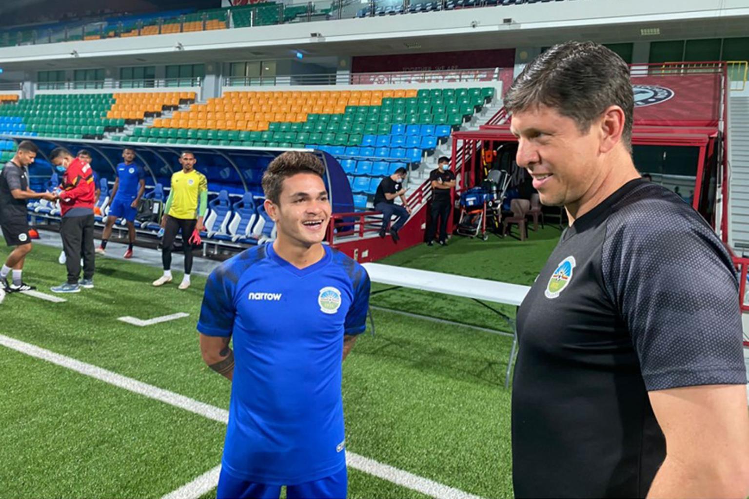 Paulo Gali (left) and coach Fabio Maciel at Jalan Besar Stadium.