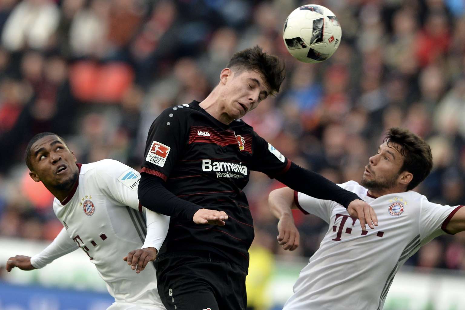 Bayern's Douglas Costa (left) and Juan Bernat battle for a header with Leverkusen's Kai Havertz.